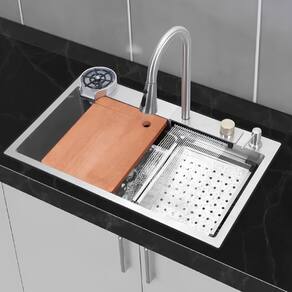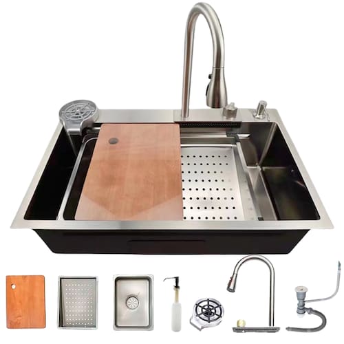 Conteúdo do Pacote: • 1x Cuba Gourmet • 1x Conjunto Torneira Extensível + Cascata • 1x Lavador de Copos • 1x Dispenser de Detergente • 1x Tábua de Corte • 1x Cesto • 1x Escorredor de Legumes • 1x Kit de Instalação