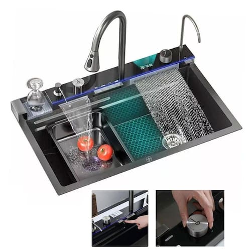 Agua em forma de cascata, para lavar a louça sem pressao e grande cobertura de fluxo de água.