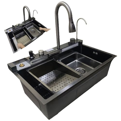 Água em forma de cascata, para lavar a louça sem pressão e grande cobertura de fluxo de água.