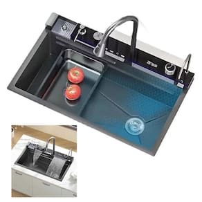 Agua em forma de cascata, para lavar a louça sem pressao e grande cobertura de fluxo de água.