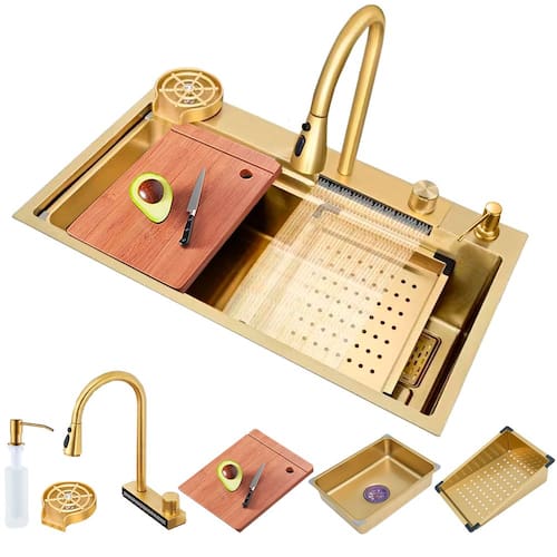 ITENS INCLUSOS: Cuba Cascata Premium projetada para aplicação SOBREPOSTA ou EMBUTIDA. Torneira monocomando com cascata e spray Lavador de copos Dosador de sabão de 300ml com sistema recarrega fácil. Não é necessário retirar o reservatório para reabastecê-lo. 2 Cestos escorredores em aço inox Tábua de corte Válvula 4 1/2 '' (totalmente compatíveis com o uso de trituradores elétricos). Válvula e tubulação do ladrão Sifão