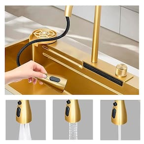 ESPECIFICAÇÕES TÉCNICAS Marca: BRINOVAR Material: Aço Inoxidável 304 Cor: Dourado Acabamento: Escovado Acetinado Formato: Retangular Medidas total da cuba: 75 (C) x 45 (L) x 22 (A) cm Medida interna da cuba: 70 (C) x 35 (L) x 21,5 (A) cm Capacidade Total: 54 Litros Espessura: 3mm Diâmetro furo para torneira: 35mm (posição central) Diâmetro furo para dispenser: 28mm (lado direito) Diâmetro furo para lavador de copos: 28mm (lado esquerdo) Furo para válvula de 4 1/2 '' Posição da válvula: Lado Direito Modelo: Cascata Torneira: Inclusa Tipos de Jato da Torneira: Ducha, Aerado e Jato Duplo Indicação: Cozinha, Espaços Gourmet, Ilhas e Churrasqueiras Aplicação: Embutir ou Sobrepor Anti-Ruído: Sim, pintura externa e aplicação da manta no fundo e laterais Válvula Escape/Ladrão: Sim Acompanha Acessórios: Sim Aceita Triturador: Sim Sifão: Sim Garantia: 90 dias
