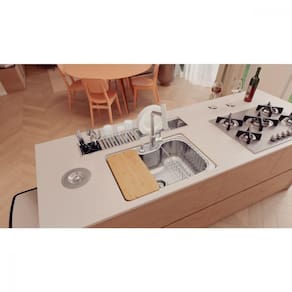 - Acessórios Inclusos: Inclui dosador de sabão, tábua de madeira e cesto aramado, adicionando funcionalidade e praticidade.