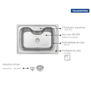 A praticidade na cozinha é o ponto central para as tarefas diárias ficam mais simples de serem cumpridas. A Cuba Tramontina Morgana 60 FX Undermount em Aço Inox com Acabamento Acetinado com Válvula 69x49 cm vai adicionar muita facilidade à sua vida e se encaixar perfeitamente no espaço que você precisa. Com estrutura de cuba simples produzida em aço inox, ela tem instalação muito fácil, possui 2 furos para torneira e profundidade de 20,3 cm. Seu acabamento acetinado garante muito mais praticidade, pois a torna super fácil de limpar. Um produto pensado para sua cozinha e para te fazer ter muito mais prazer em estar na cozinha!