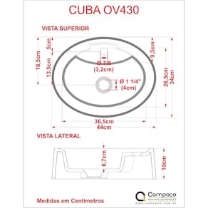 A Cuba Ov430 Onix tem seu design tradicional, oval e um excelente escoamento de água. Fabricada em mármore sintético com acabamento em Hard Lacca PU, material bem semelhante a louça, muito resistente e mais econômico! Acompanha Manual de Instalação: Não Acompanha Torneira: Não Altura: 10 cm Comprimento: 44 cm Cor: Preto Cor do Produto: Preto Diâmetro do furo: 32 mm Diâmetro para válvula: 40 mm Itens Inclusos: 1 Cuba Itens Inclusos: 1 Cuba Largura: 34 cm Manual de Montagem e Instalação: https://cdn2.madeiramadeira.com.br/atributo/compace/370829-manual-cubas-com-torneira.pdf Origem do Produto: Nacional Peso: 4,4 kg Possui furação para torneira: Sim Possui ladrão: Não Válvula indicada: Válvula: 1 1/4’’ (40mm) ou Válvula: 7/8’’ (32mm) Válvula oculta: Não Ean: 7893640086892