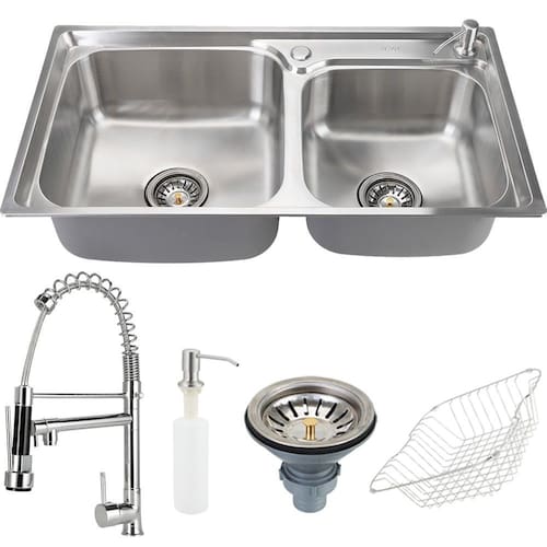 Cuba Potiguara - Válvulas de escoamento - Dosador de detergente 300 ml - Cesto escorredor - kit acessórios de instalação - Placa de reforço para Torneiras gourmet - Misturador Munim - Mangueiras flexíveis de aço trançado 50 cm - kit de parafusos de instalação.