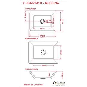 Já as dimensões dessa pia se adaptam facilmente às bancadas de diversos tamanhos. Além disso, a cuba Messina possui grande qualidade, sendo fabricada em mármore sintético com acabamento em Hard Lacca PU, material semelhante à louça no quesito resistência, porém, bem mais econômica. Outro detalhe é que já vem com furação para válvula 7/8', o que proporciona um excelente escoamento da água e mantendo a pia mais limpa.