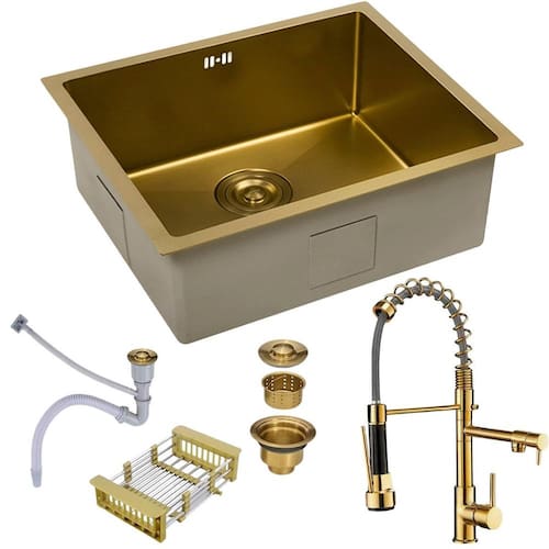 O Kit Acompanha: -cuba Gourmet Pia Inox Quadrada Cor Dourada 50x45 Com Acessórios -torneira De Cozinha Pia Gourmet Monocomando Cor Dourada Inox 304 ESPECIFICAÇÕES TÉCNICAS CUBA: