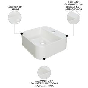 Fabricada em lapimat, um material inovador que combina resina poliéster, cargas minerais selecionadas e aditivos, a Cuba de Apoio se destaca pela resistência e durabilidade excepcionais, além de já vir com furação para torneira. A dupla camada de pintura poliéster PU de alta performance, complementada por uma de verniz protetor resultam em um acabamento matte fosco com toque acetinado impecável.