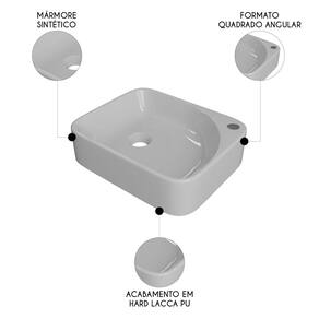 Fabricada em mármore sintético, um material composto por resina poliéster e carga mineral, com camada de Gel Coat e acabamento de pintura poliéster PU, ela é bastante semelhante à louça, porém mais econômica. A Cuba de Apoio combina resistência e durabilidade, além de já vir com furação para torneira, o que torna a instalação ainda mais prática. O acabamento em Hard Lacca PU garante brilho e proteção, proporcionando um visual sofisticado e fácil de manter.