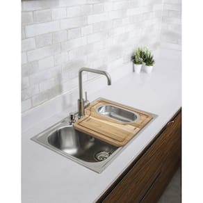 Informações Gerais - Aço inox AISI 304 com acabamento acetinado - Furos para misturador e dosador de sabão 35 mm - Acessórios que acompanham: Válvula Ø 4 1/2" + dosador + tábua + cesto