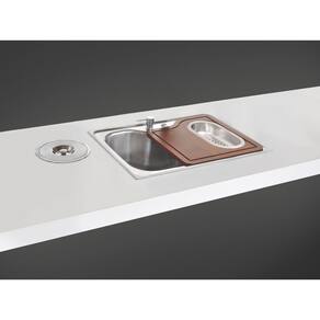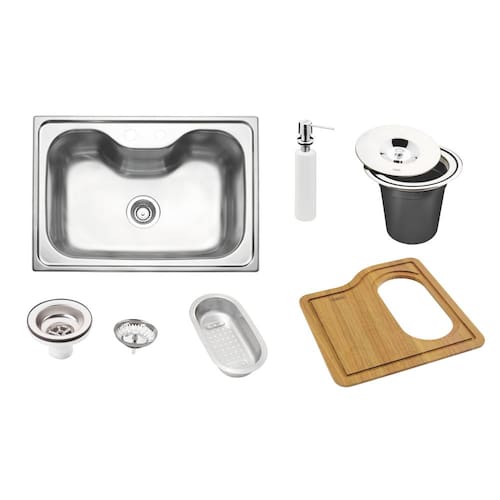 Aço inox AISI 304 com acabamento ACETINADO Furos para misturador e dosador de sabão 35 mm Acessórios que acompanham: Válvula Ø 4 1/2' + dosador + tábua + cesto+ lixeira 5 litros de embutir