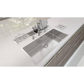 Uma cozinha sofisticada com tecnologia de ponta torna nossa casa mais confortável e aconchegante. A Cuba Tramontina Quadrum 90 em Aço Inox com Acabamento Scotch Brite da Linha Tramontina Design Collection traz a exclusividade e inovação da Tramontina em uma peça de requinte. Produzida em aço inox com elegante acabamento Scotch Brite, é uma cuba com grande profundidade que se adapta aos mais variados projetos. Com design diferenciado, ela transmite personalidade em qualquer decoração usada na cozinha. Possui dimensões de 90x40 cm e garante resistência e higiene. Possui duas maneiras de instalação: por cima do granito (semi flush) e no novo sistema flush, onde a cuba fica perfeitamente nivelada a bancada. Acompanha válvula com diâmetro de 4 1/2 polegadas com escape e manta adesiva antirruído.
