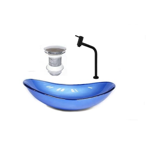 Cuba Vidro Oval 55Cm Azul Escuro + Valvula + Torneira Preta