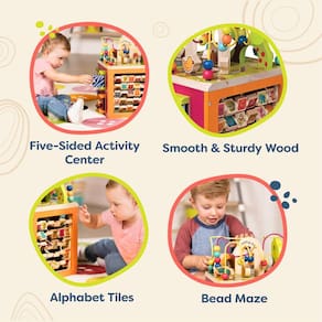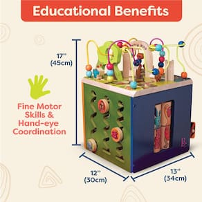 B. toys – Cubo de Actividades de Madera – Centro de Actividades – Juguete Educativo – Juguetes de Madera para Niños Pequeños – 1 Año + – Zany Zoo - DE 1 A 3 AÑOS – El B. Zany Zoo es seguro y divertido para los bebés más pequeñitos hasta los niños más grandes. El producto mide 45,7 cm de alto x 35,6 cm de ancho x 35,6 cm de largo. - COLORES Y CALIDAD B. – Todos los juguetes del Cubo de Actividades de Madera B. Zany Zoo cuentan con el encantador esquema de colores de B. Toys, un enfoque artístico para los juguetes infantiles y la reconocida calidad para heredar. - DURADERO Y FÁCIL DE LIMPIAR – El resistente cubo de actividades de madera con cortes precisos está hecho con la artesanía líder en la industria, otra característica distintiva de B. Toys. - CINCO CARAS DE DIVERSIÓN – El B. Zany Zoo está lleno de grandes actividades, y cada cara tiene algo diferente para descubrir. En un lado hay ventanas con amigos animales escondidos, en otro un alfabeto giratorio completo con más animales bellamente ilustrados, en el tercer lado hay tres caminos de carreras en zigzag, y en el cuarto hay giradores que crean combinaciones divertidas de animales. En la parte superior, por supuesto, hay una montaña rusa de cuentas de madera que corre sobre laberintos de senderos adorables. - HORAS DE ENTRETENIMIENTO – Con más de una docena de juguetes para niños pequeños, esta caja de alegría está lista para mayor interacción, más aprendizaje y, sobre todo, mucha diversión. Puede ser disfrutado por más de un bebé a la vez.