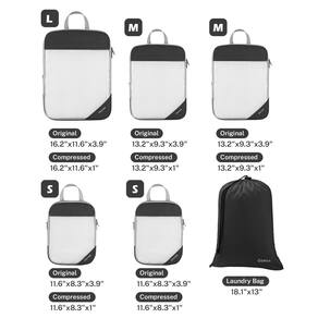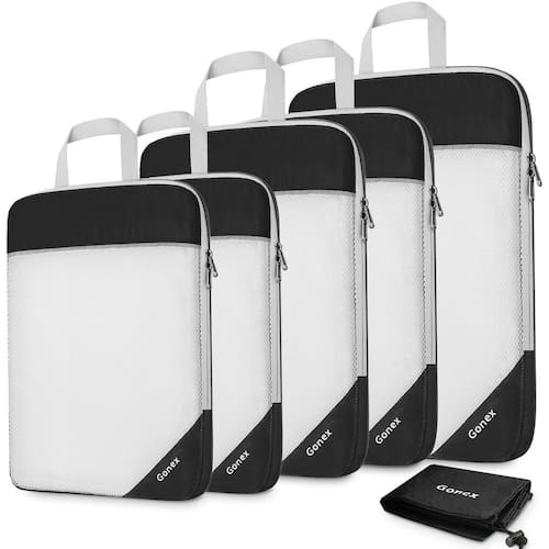 Gonex Organizadores de malha de compressão 1L + 2M + 2S + saco de lavanderia preto - O conjunto inclui: 1 x grande (41 x 29,5 x 9,9 cm), 2 x médio (33,5 x 23,5 x 9,9 cm), 2 * pequeno (29,5 x 21 x 9,9 cm) e 1 * saco de roupa (46 x 33 cm) - Material macio: O poliéster ultra macio e leve com alta densidade e extensibilidade e zíper suave tornam este conjunto de cubos de compressão extremamente durável quando é preenchido com mais itens essenciais. - Revolucionou sua embalagem: nossos organizadores facilitam a embalagem e reduzem drasticamente o espaço necessário para viagens. Chega de embalar! - Economia de espaço: zíperes duplos do cubo de embalagem funcionam perfeitamente na compressão de roupas para ajudar a economizar espaço em sua bagagem de mão ou mochila de viagem. Ótimo equipamento de viagem para minimizar o tamanho da sua bagagem de mão. Alça rápida para fácil acesso a retirar cubos embalados da mala ou mochila. - Adequado para todas as ocasiões: ideal para férias em família, viagens de negócios, acampamento ao ar livre e armazenamento diário.