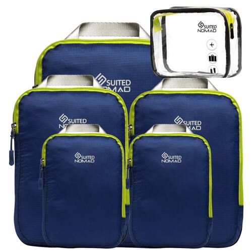 6 conjuntos/3 conjuntos de organizadores de compressão ultraleve, mala e mochila de viagem, Azul escuro - Acessório essencial para homens e mulheres - O conjunto de cubos de embalagem de compressão inclui: 1 cubo extragrande: 40,6 x 30,5 x 2,5 cm; 2 cubos grandes: 38 x 28 x 2,5 cm; 2 cubos médios: 28 x 20 x 2,5 cm; 1 bolsa de higiene transparente tamanho 19,6 x 15,5 cm. 0 x 15 cm. cm - Economize o espaço e o tempo necessários ao embalar – sistema de compressão de zíper duplo que aspira o excesso de ar dos cubos e os torna incrivelmente compactos. - Compre uma vez e tenha para sempre - organizadores de mala leves, mas duráveis, feitos de nylon ripstop resistente à água e respirável que protege totalmente suas roupas, produtos de higiene pessoal e equipamentos durante qualquer aventura. - Paz de espírito é nossa prioridade - ninguém quer ficar preso com uma bolsa de viagem rasgada no meio das férias - é por isso que usamos costuras reforçadas e zíperes duráveis que deslizam suavemente mesmo quando os cubos estão cheios. - Itens essenciais para viagens de avião ou navio de cruzeiro – ou você está voando para o exterior com seus filhos para a Europa ou apenas passeando pelo Alasca, nossos organizadores compressíveis ajudam você. - Apenas qualidade premium para você - Temos orgulho de fornecer produtos de qualidade e suporte ao cliente para nossa comunidade de viajantes e criamos essas bolsas de cabine organizadora de bagagem com cuidado excepcional para oferecer a experiência mais agradável durante viagens de avião, caminhadas, acampamento, mochilão, trailer ou viagens longas de carro.