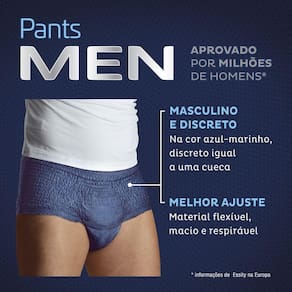 TENA Pants MEN é uma roupa íntima descartável que veste como cueca, desenvolvida especialmente para homens com incontinência urinária moderada que buscam conforto, discrição, segurança contra vazamentos e manter o cuidado com a pele. Possui neutralizador de odor e uma zona de absorção segura, formato anatômico que se ajusta perfeitamente ao corpo proporcionando conforto, facilidade de uso e discrição. A segurança deve-se especialmente à uma zona de absorção frontal que absorve rapidamente a urina, mantendo-a longe da pele e assim, deixando-a seca, auxiliando a reduzir o risco de irritações ou infecções cutâneas. TENA Pants MEN é ideal para homens ativos, discreto como uma cueca, com controle de odor e alta absorção.