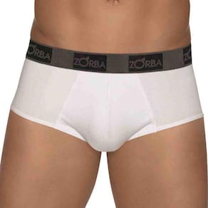 Cueca Zorba modelo Slip Confort fabricada com lateral ligeiramente mais larga em tecido de malha de algodão com elastano e com elástico aparente personalizado. Modelo com bojo forrado e com ajuste perfeito ao corpo, proporcionando grande conforto.