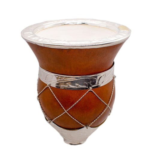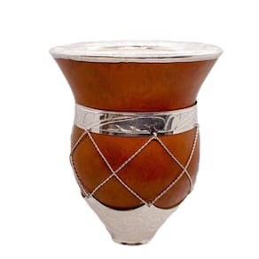 Cuia com bocal de prata e chapinha de ouro. Base em prata com detalhes de arame em todo o porongo. O porongo é um produto natural (fruto lenhoso): o formato, tamanho, tonalidades de cores são variáveis. Eventualmente algumas marcas naturais fazem parte do produto. Disponibilizamos cuias lisas e trabalhadas (martelado artesanal).