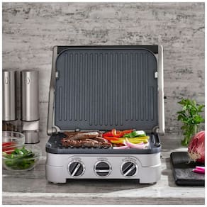 Com a conveniência de cocção 5 em 1, a Churrasqueira Indoor Griddler da Cuisinart pode lidar com tudo, desde panquecas e salsichas até queijos grelhados, bifes, hambúrgueres e paninis. Uma tampa flutuante e um conjunto de placas antiaderentes reversíveis transformam o Griddler em uma churrasqueira de contato, prensa de panini, churrasqueira completa, chapa completa ou metade churrasqueira metade chapa. Os controles de temperatura dupla permitem ajustar de 'aquecer' a 'selar' no modo chapa/prensa de panini, e de 93ºC a 218ºC no modo chapa, garantindo que tudo seja perfeitamente cozido todas as vezes nas placas antiaderentes para refeições práticas. A limpeza é fácil, graças às placas removíveis laváveis na lava-louças, bandeja de gotejamento removível e uma ferramenta de limpeza. A Churrasqueira Indoor Griddler PFAS-free da Cuisinart tem tudo o que você precisa para refeições deliciosas, fáceis e versáteis.