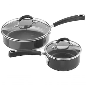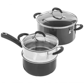 Conjunto completo: 1,5L e 2,5L (com tampas), frigideiras de 20cm e 25cm, panela sauté de 3L (com tampa), caldeirão de 6L (com tampa) e inserto para vapor de 18cm.