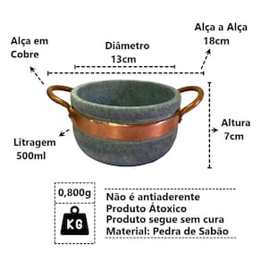 Cumbuca Alça de Cobre Pedra Sabão Tigela Caldo Sopa 500ml mantém tanto o calor, quanto o frio, sendo assim, poderá utilizar a tigela para molhos quentes e frios, caldos, sopas e pequenas porções.