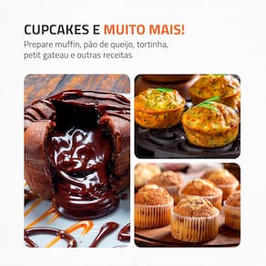 Prepara até 7 cupcakes simultaneamente, design em aço inox, revestimento antiaderente, controle automático de temperatura, alça fria, lâmpada piloto.Chapa antiaderente