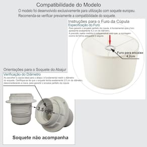 É exclusivamente para fixação do soquete bocal furo 4,2cm. O produto composto apenas a cúpula, não acompanha abajur. Resistente á maresia, garantia 1 ano após recebimento. Sua utilização para bases e pedestal de abajur, abajur de quarto, abajur de sala, abajur de cabeceira, abajur moderno, luminárias e pendentes.