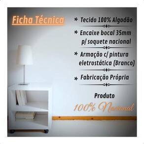 Especializada na fabricação de acessórios e componentes para iluminação, nossos produtos são confeccionados em materiais com qualidade e resistência, atendendo as normas do mercado com uma variedade de opções ao seu critério e gosto. -------------------------------------------------------------------------------------------------------------------- Cúpula de tecido, arame pintado de branco para soquete nacional. -------------------------------------------------------------------------------------------------------------------- Medidas Boca de cima: 40 cm Boca de baixo: 40 cm Altura: 28 cm Encaixe do soquete: 35mm Contra defeitos de fabricação. Envio Loja de fábrica Marca: Não Informado Ean: 7899067046167