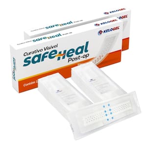 Curativo visível safe heal post-op 10x30 5x25 20un kelogel Tamanho: 10x30cm O curativo visível safe heal post-op kelogel é um curativo estéril com design inovador que permite monitorar feridas sem trocas desnecessárias. É translúcido, maleável, impermeável e possui uma almofada de espuma em formato de colmeia para visibilidade. Sua aplicação é facilitada por tiras destacáveis e um filme de poliuretano.
