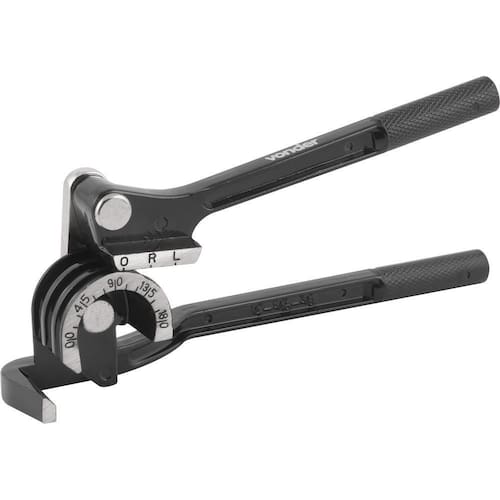 Curvador 3 em 1, permite curvar 3 medidas de tubos de cobre diferentes e contém escalas para indicar o grau desejado a ser dobrado