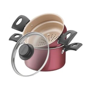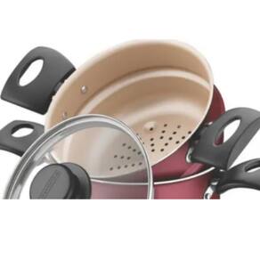 Cuscuzeira vermelha em alumínio com revestimento em antiaderente Starflon e tampa de vidro. Devido ao revestimento antiaderente os alimentos não grudam, proporcionando facilidade na limpeza, além de deixar sua cozinha muito mais divertida. Diâmetro: 16cm Capacidade: 1,8L Serve 6 Pessoas.
