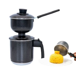 Cuscuzeiro individual tipo nordestino, cada jogo é composto por duas panelas de alumínio com duas tampas, uma para ferver água e uma para fazer o cuscuz ambas com cabos de Baquelite. Ideal para preparar porções individuais de cuscuz.