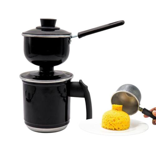 Cuscuzeiro individual tipo nordestino, cada jogo é composto por duas panelas de alumínio com duas tampas, uma para ferver água e uma para fazer o cuscuz ambas com cabos de Baquelite. Ideal para preparar porções individuais de cuscuz.