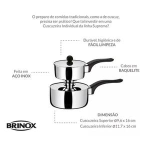 Cuscuzeira Individual - Suprema Brinox A Cuscuzeira Individual Suprema É Feita Em Aço Inox, Material Durável, Higiênico E De Fácil Limpeza. Possui Cabos Em Baquelite. Como O Próprio Nome Diz, É Ideal Para Preparar Porções Individuais Do Delicioso Cuscuz. O diferencial da Cuscuzeira Brinox é possuir estrutura em aço inoxidável polido, sem revestimento. Caracteristicas: Marca: Brinox Linha: Suprema Material: Aço Inoxidável Dimensões aproximadas: Cuscuzeira Superior: 9,1cm x 7,5cm Cuscuzeira Inferior: 11,8cm x 6cm Capacidade: 250mL 7896502851874 Marca: Não Informado