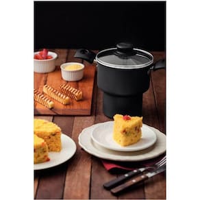 Corpo de alumínio com espessura de 1,6 mm que proporciona cozimento rápido e uniforme.