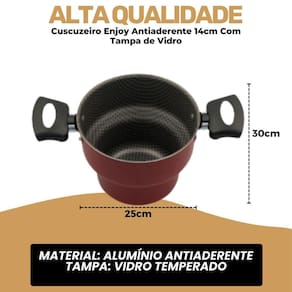 O Cuscuzeiro Enjoy Antiaderente de 14 cm, na vibrante cor vermelha, é a escolha perfeita para quem valoriza qualidade e praticidade na cozinha. Com uma tampa de vidro que permite o acompanhamento do cozimento, este produto é ideal para preparar deliciosos pratos de maneira simples e eficiente. Sua superfície antiaderente garante que o alimento não grude, facilitando tanto o preparo quanto a limpeza.