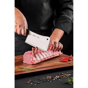 Cutelo Tramontina Century com Lâmina em Aço Inox e Cabo de Policarbonato com Fibra de Vidro 6" Corte com muita facilidade! O Cutelo Tramontina Century com Lâmina em Aço Inox e Cabo de Policarbonato com Fibra de Vidro 6 polegadas da linha Century possui lâmina forjada de aço inox fabricada com aço de altíssima qualidade que, aliada ao eficiente com tratamento térmico diferenciado, composto por têmpera, sub-zero e revenimento, além de dureza de 50 e 53 HRc, confere à faca uma grande resistência ao desgaste do fio. Com cabo de policarbonato com fibra de vidro, que tem boa resistência a impactos, você terá na sua casa um cutelo que vai permanecer bonito por muito mais tempo. Indicado para partir e separar ossos, tem cabo anatômico e ergonômico, que proporciona a você muito mais segurança no manuseio. Informações Gerais Ideal para quebrar e separar os ossos. A lâmina forjada de aço inox especial garante um fio com maior durabilidade e precisão. A lâmina possui tratamento térmico diferenciado, composto por têmpera, sub-zero e revenimento. E conta com dureza da lâmina de 55 e 58 HRC, que garante maior resistência do fio e precisão no corte. O cabo de policarbonato reforçado com fibra de vidro garante alta durabilidade, equilíbrio e segurança. O cabo ergonômico proporciona maior segurança, equilíbrio e conforto na hora do corte. Pode ir à máquina de lavar louças facilitando seu dia a dia.