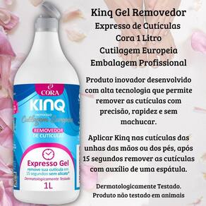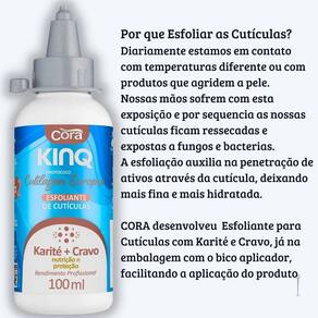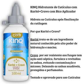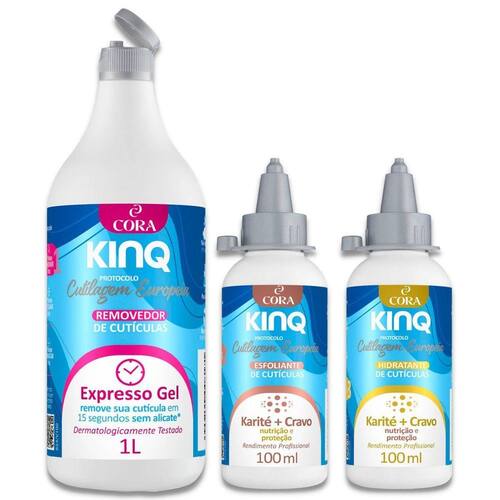 Este Kit contém: Kinq Gel Expresso Removedor de Cutículas Embalagem Fliptop com 1litro - Cora Kinq Esfoliante de Cutículas com Karité+Cravo 100ml com bico dosador - Cora Kinq Hidratante para Cutículas com karité+Cravo 100ml com bico dosador - Cora Cutículas mais saudáveis, hidratadas e macias com os novos produtos da Linha KinQ Cora você tem opção de não retirar as cutículas usando o método de Cutilagem Europeia. Kinq removedor em gel expresso retira as cutículas que ficam grudadas nas unhas, sem auxílio do alicate, amolece em apenas 15 segundos e permite removê-las com precisão e sem dor. Kinq Esfoliante de Cutículas indicado para protocolo Cutilagem Europeia. Esfolia as cutículas, renovando e tirando a pele morta. Suave, não agride, é testado e aprovado para uso nas cutículas.