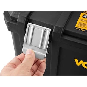 Possui 1 compartimento com suporte removível. Conta com alça emborrachada para transporte, além de porta-cadeado e fechaduras metálicas reforçadas. Permite ser acoplado no organizador plástico OPV 700 (61.08.000.700) e na caixa plástica para ferramentas com rodas CRV 700 (61.05.007.000) (não acompanham).