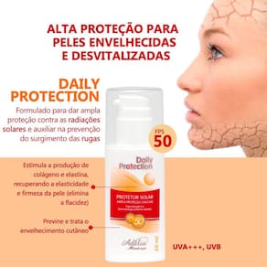 Daily Protection é uma linha de filtros solares especiais, com múltiplas funções que vão além do controle ultravioleta. Constitui em um método multifuncional que alia fotoproteção à um completo tratamento antiaging, antioxidante, regenerador celular, cicatrizante e de alto grau de hidratação; protegendo contra as radiações solares, prevenindo rugas precoces através da ação dos filtros solares UVA+++, UVB e da Vitamina E (acetato de tocoferol) e auxiliando na cicatrização da pele pós procedimentos estéticos variados (cirurgias plasticas, peelings químicos de alta ou baixa intensidade, microagulhamento, jato de plasma)