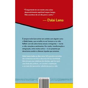 Clássico do pensamento budista, Dalai Lama todos os dias reúne 365 preceitos extraídos dos numerosos escritos e discursos de Sua Santidade o Dalai Lama para um ano de muita iluminação. Considerado um dos maiores mestres espirituais de nosso tempo e ganhador do Prêmio Nobel da Paz de 1989, o Dalai Lama presenteia o leitor com um livro repleto de pequenas reflexões que funcionarão como um poderoso antídoto contra as incertezas inerentes à vida em sociedade. Em Dalai Lama todos os dias , antologia selecionada pelo jornalista e especialista em religiões orientais Bernard Baudouin, você encontrará mensagens diárias de sabedoria, esperança e serenidade. Independentemente de crença ou religião, essas mensagens vão iluminar seu estado de espírito e renovar sua percepção do mundo e as escolhas fundamentais que dela decorrem. Por meio de temas como a passagem para outras dimensões através da morte, a obtenção da paz em meio a experiências ruins, a busca pela compaixão e o perdão dentro de si, a permanência da alma, a conexão com a natureza e a idealização da moral que nos guia, o supremo sacerdote do budismo tibetano demonstra que a nossa verdadeira natureza emerge da comunhão entre espírito e matéria. Além disso, ele explica como essa virada de chave no pensamento pode ser a chance para a evolução da humanidade como um todo. Mais do que uma coleção de citações, Dalai Lama todos os dias não só é fonte de conforto, como também um convite à meditação e à busca por uma atitude mais segura e equilibrada nos momentos em que somos confrontados pelos desafios da vida. “É importante ter em mente uma coisa: desenvolvimento espiritual requer tempo. Não acontece de um dia para o outro.” - Dalai Lama