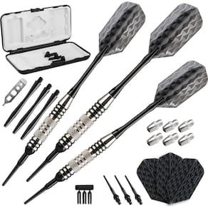 - O conjunto inclui três dardos, voos extras, eixos de nylon, pontas, protetores de voo, chave de dardos e adicionar uma grama