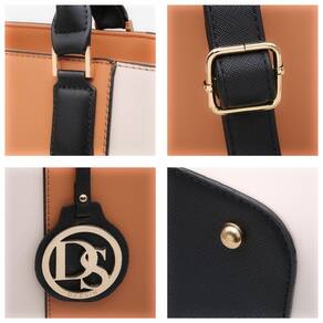 MATERIAL Couro Vegan Saffiano PU Signature Dasein com detalhes dourados reluzentes, fundo plano com tachas, bolsa estruturada em dois tons. Nenhum animal foi ferido.