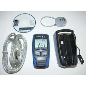 Descrição geral O registrador de dados datalogger modelo kr420 possui memória para até 16350 registros completos de temperatura e umidade relativa do ar 32700 dados em intervalos que podem ser configurados pelo usuário desde 1 segundo até 24 horas via software. Com um amplo visor lcd, permite a visualização da temperatura e umidade seleção via tecla , além de mostrar a data e o horário correntes, o nível de carga da bateria e os valores máximos e mínimos registrados. Também permite a configuração de alarmes de alta e baixa e a sinalização dos mesmos via led. Para garantir a segurança e integridade dos dados coletados e evitar que pessoas não autorizadas acessem e/ou apaguem os mesmos, o kr420 é fornecido com uma capa protetora e cadeado com senha. Ele dispensa o uso de interface para descarregar os dados coletados no computador pois possui conexão usb direta cabo usb e software inclusos . É resistente à água e possui acabamento superficial emborrachado.