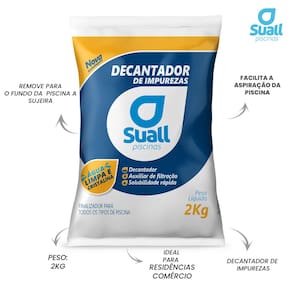O Decantador de Impurezas Sulfato de Alumínio 2Kg da Suall Piscina é um produto eficiente para manter a limpeza da sua piscina. Indicado para aglomerar impurezas, fazendo-as decantar para o fundo, facilita a aspiração e limpeza. Com rápida solubilidade, ajuda na correção do pH e é recomendado para piscinas de fibra, vinil, plástico e alvenaria. Com apenas 40g para cada 1.000 litros, você elimina sujeiras indesejadas e mantém a água limpa e pronta para uso. *Imagens meramente ilustrativas.