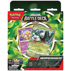 O Pokémon TCG: Meowscarada/Quaquaval ex Deluxe Battle Deck é um produto de baralho pronto para jogar que traz um deck temático de 60 cartas focado em um dos Pokémon ex: Meowscarada ex ou Quaquaval ex, enviado de forma aleatória em cada caixa. Cada baralho é estruturado com estratégia intermediária, voltada a jogadores que já dominam as regras básicas e desejam recursos adicionais como cartas de Treinador e Pokémon de suporte.