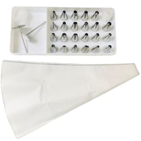 Contem 23 Bicos,2 adaptadores de Bico,2 Sacos de Confeitar e 2 Bailarinas.