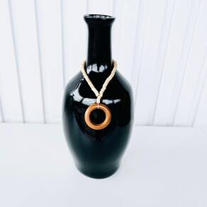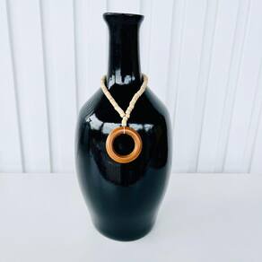 Decoração sala rack aparador vaso garrafa de cerâmica moderno liso na cor preto brilho com detalhe pingente de madeira.